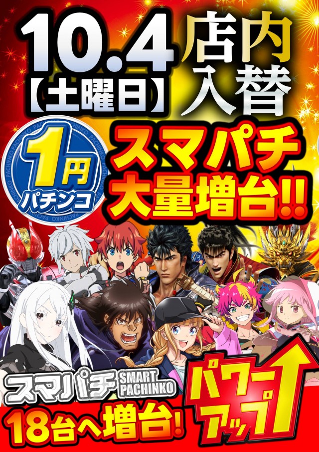 明日☆大型店内入替☆1円パチンコ☆スマパチ増台☆