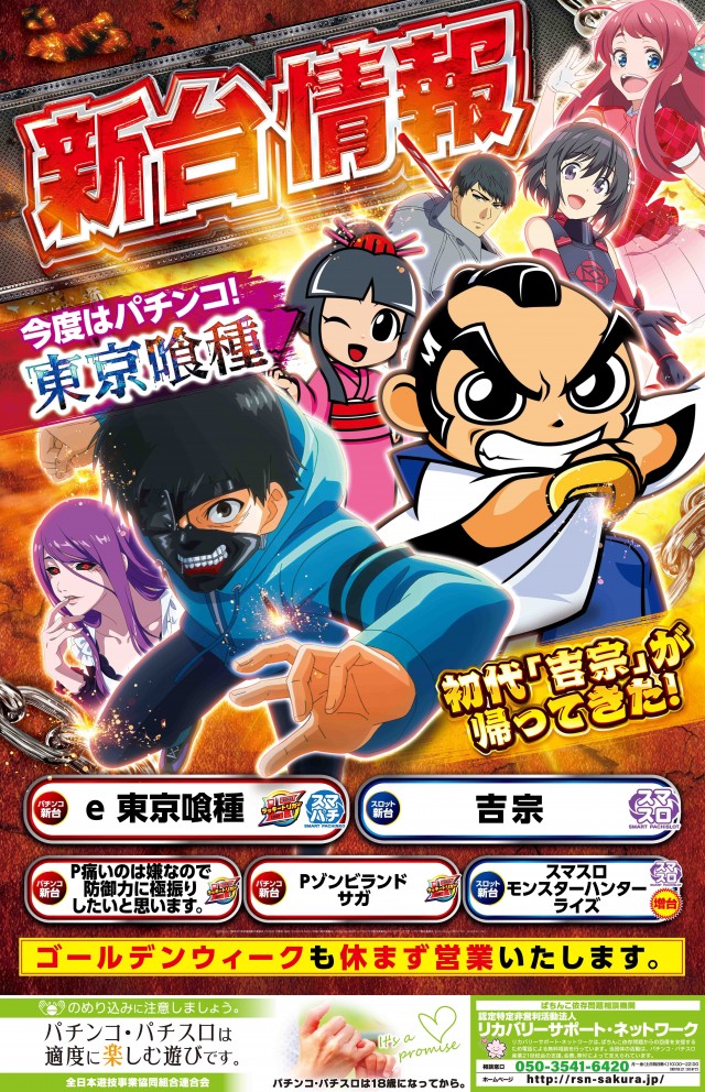 本日新台入替! e東京喰種・スマスロ吉宗他、全5機種導入!