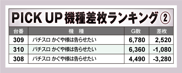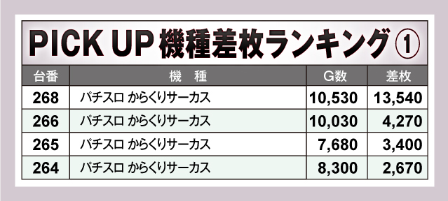 まずは差枚ランキングのチェックから。30台のうち25台が差枚+2,000枚オーバーで、+3,000枚オーバーは15台出現。それらのなかでもっとも優秀だったのは、268番台の「パチスロ からくりサーカス」で、差枚は+13,540枚の超記録をマーク! その他ランクイン機種をチェックしてみると、ハイスペックスマスロ機種やジャグラーシリーズまで幅広い機種がランクイン。訪れたファンたちが存分に楽しめる環境が用意されていたようだ!