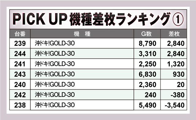 続いては、当日とくに盛り上がっていた7機種を紹介。7機種すべてから両台が出現していたが、とくに「沖ドキ!ゴージャス-30」は、ピックアップ7台のうち4台が4ケタプラス終了と素晴らしい結果を確認! これらの機種たちの盛り上がりを見れば、当日どれだけ賑わっていたかが分かってもらえたハズだ!