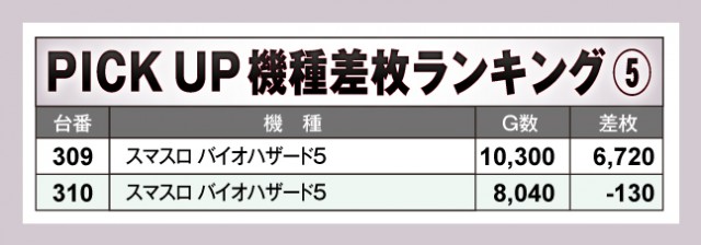 まずは差枚ランキングのチェックから。30台のうち23台が差枚+2,000枚オーバーで、+3,000枚オーバーは7台出現。それらのなかでもっとも優秀だったのは、309番台の「スマスロ バイオハザード5」で、差枚は+6,720枚をマーク! その他ランクイン機種をチェックしてみると、人気スマスロ機種を筆頭に「マイジャグラーV」や「沖ドキ!ゴージャス-30」など幅広い機種がランクイン。訪れたファンたちが存分に楽しめる環境が整っていたようだ!