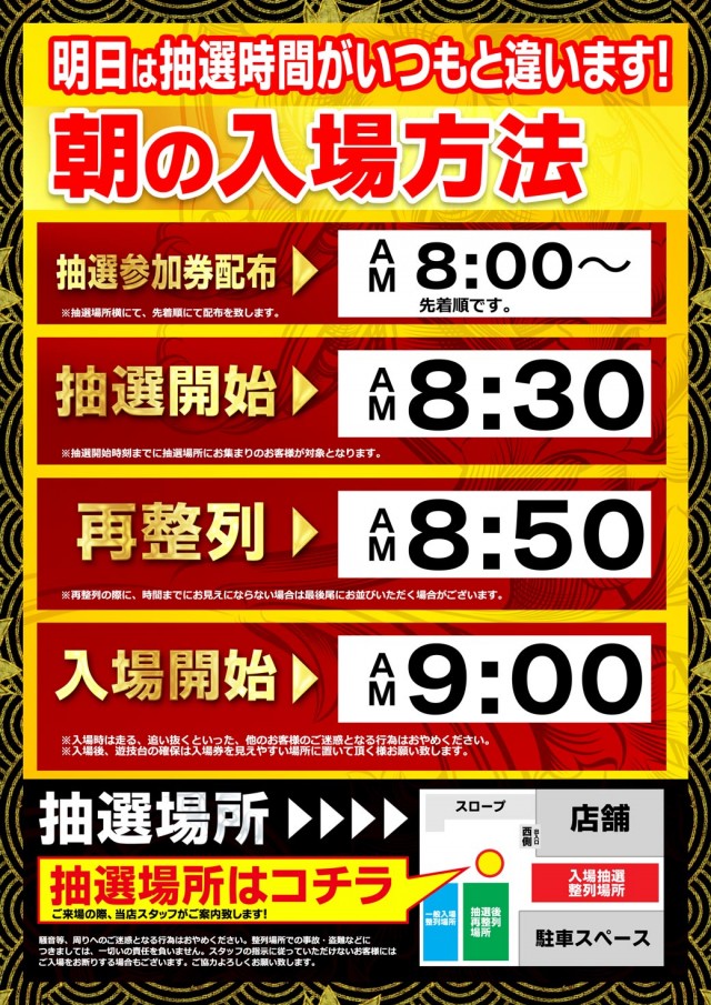 8:30~8:45抽選参加券をお配り致します。8:45より入場抽選を行い入場順番券をお配りとなります。 |