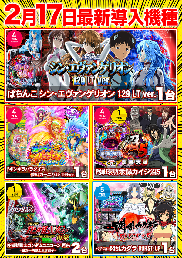 2月17日(月)新台入替!来店P景品入荷!朝9時開店