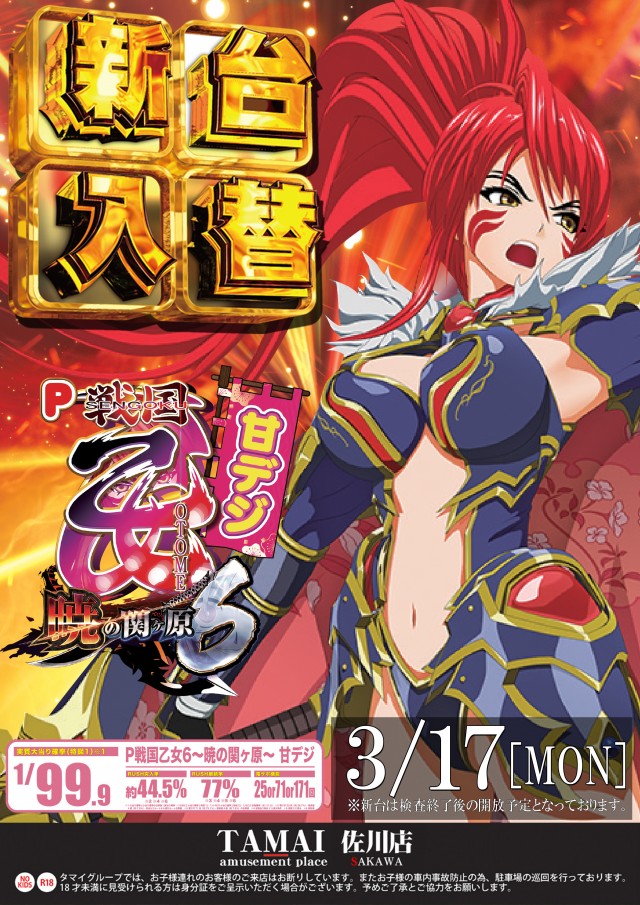 3/17(月)1P機【P戦国乙女6 暁の関ヶ原】導入予定!!