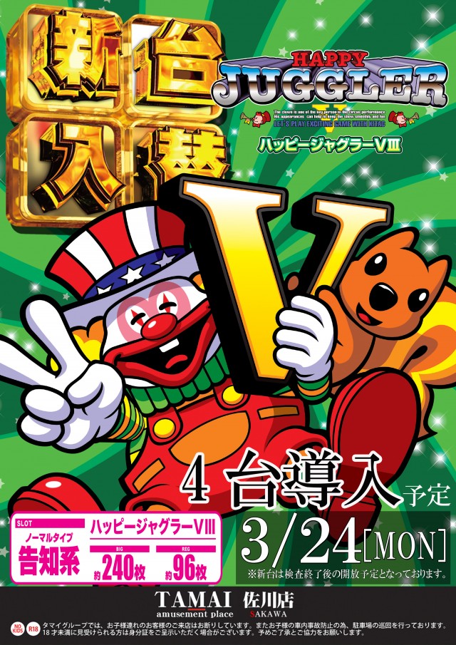 3/24(月)20C機【SハッピージャグラーVⅢ】導入予定!
