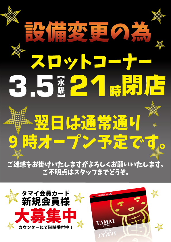 3/5(水)スロットコーナー営業時間のお知らせ!