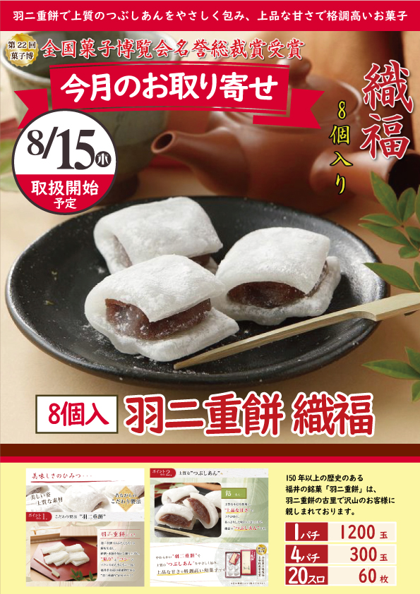 8/15(木)スイーツ今回は『羽二重餅 織福 』入荷!!