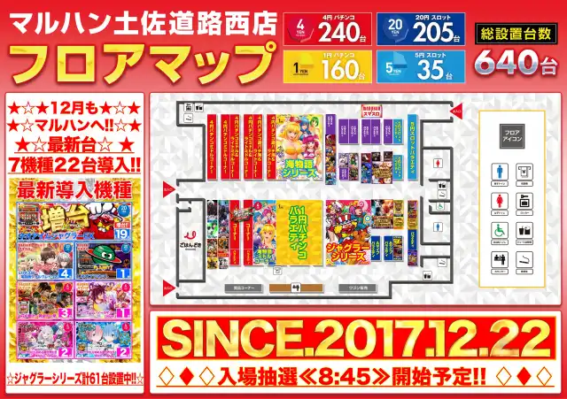 入場抽選締め切り時間は≪8時45分≫です。入場後は【遊技台確保券】+【ご着席】をお願いしております。別途抽選時間が変更となる日もございますので最新情報をご確認くださいませ。 |