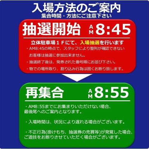 入場抽選締め切り時間は≪8時45分≫です。入場後は【遊技台確保券】+【ご着席】をお願いしております。別途抽選時間が変更となる日もございますので最新情報をご確認くださいませ。 |