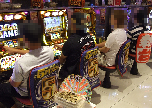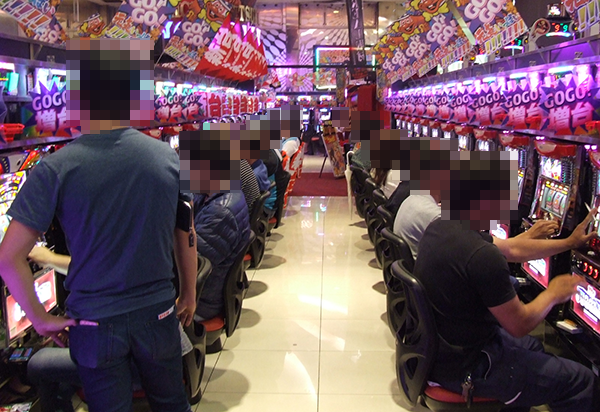 20円パチスロでは、ジャグラーシリーズがひときわ人気。機種の特徴を活かしているといったプレイヤーが多く、活気のあるシーンもたくさんみられた。