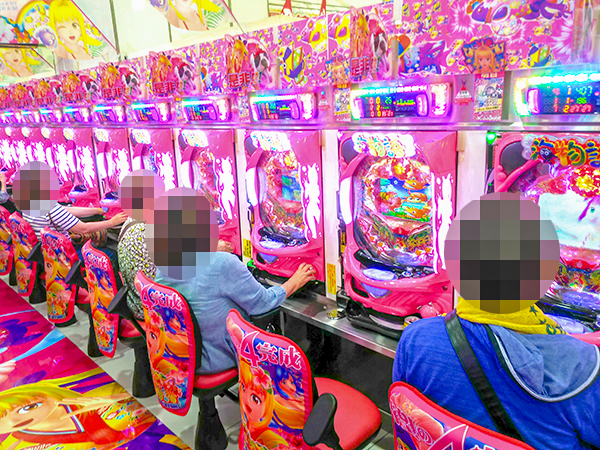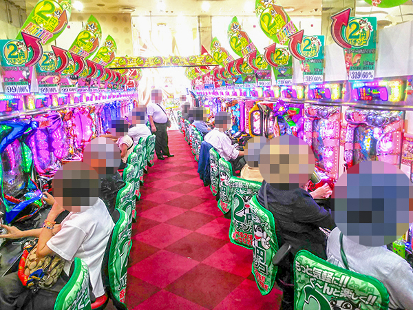 2円・1円と2種類のレートがある低貸し玉パチンコのにぎわいも大きい。スペックに関係なくプレイヤーたちはじっくりと機種の魅力を堪能していた。
