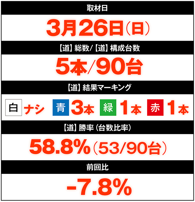 同店では今年に入ってすでに3回のヒーローズロードを実施しているのだが、パチスロ総台数420台というスケールメリットを活かし、毎度大量の【道】構成台が出現しているのである。