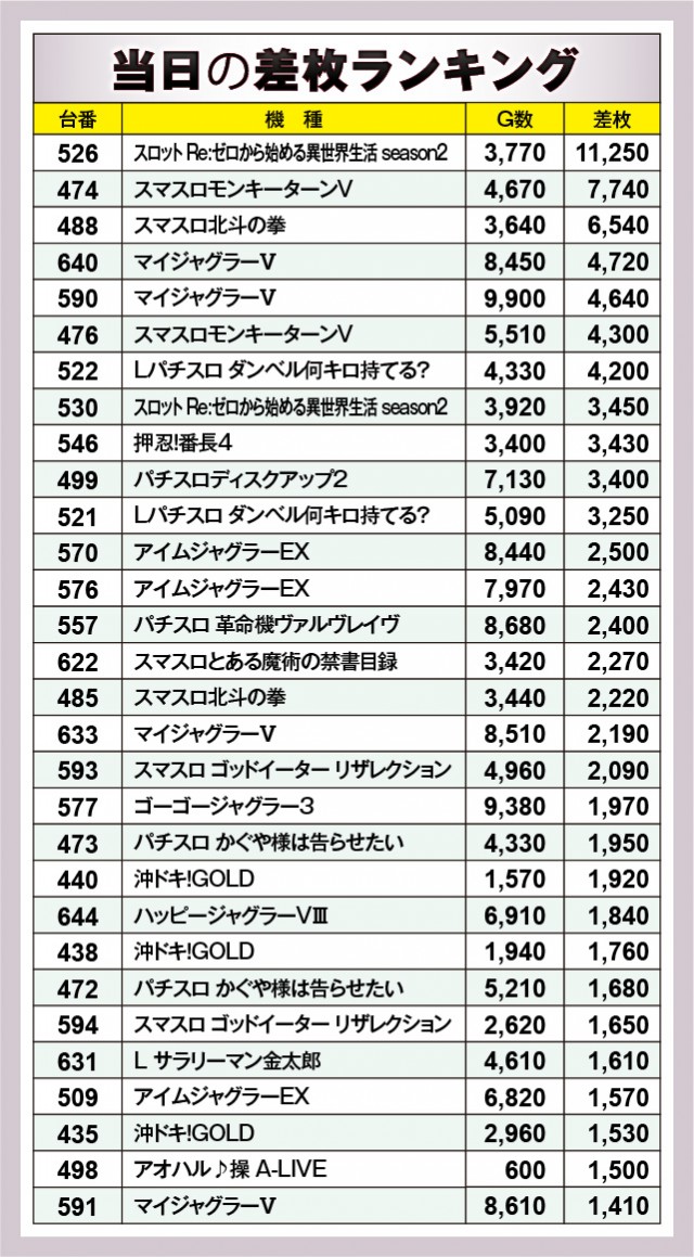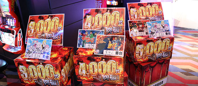 『スロット Re:ゼロから始める異世界生活 season2』にて万枚OVERが飛び出し、当日の店内の盛り上がりをリード。ほかにも『スマスロモンキーターンV』『スマスロ北斗の拳』が大台突破を果たしており、人気機種の活躍も相まって、館内は熱気に包まれていた様子だ。『マイジャグラーⅤ』も4,000枚OVERと奮起しており、さらに『パチスロディスクアップ2』も3,000枚OVERと、ノーマル機群の活躍も見逃せないポイントだ。