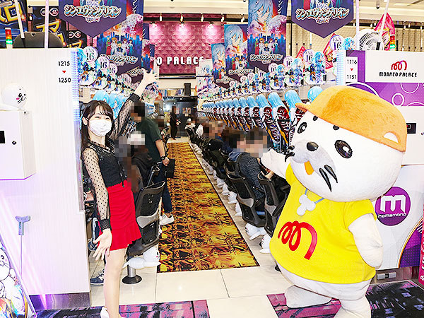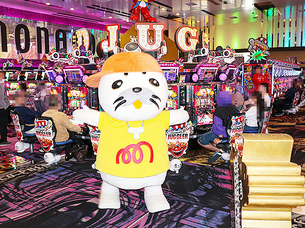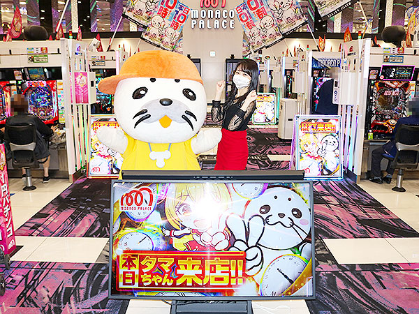 取材当日はモナコパレス公式キャラクターのタマちゃんが来店! ホール全体を大いに盛り上げていた。