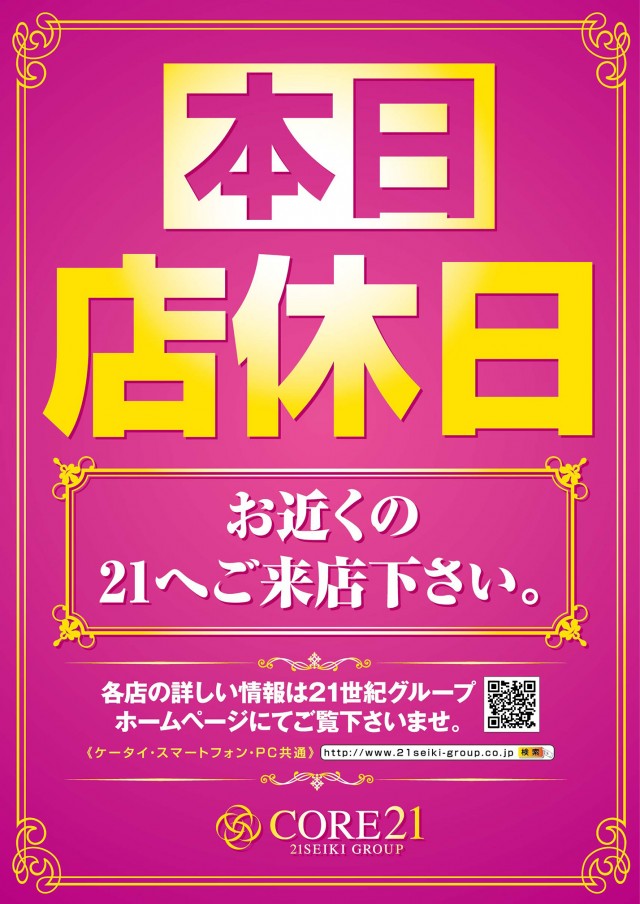 本日店休日となります。明日は朝10時新台入替オープン予定