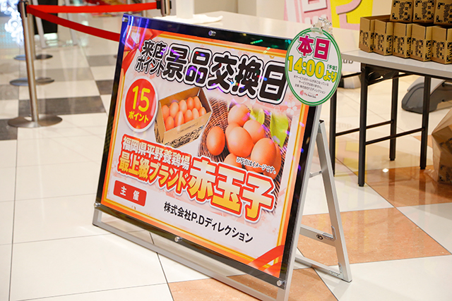 この日の交換できる景品は、福岡県平野養鶏場の最上級ブランド玉子の赤玉子。