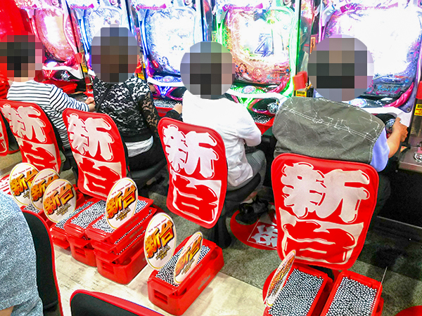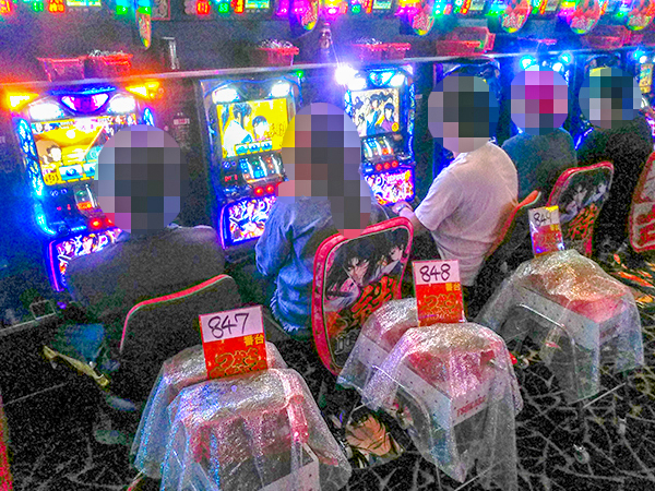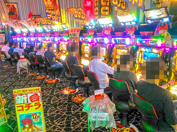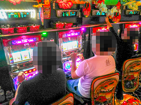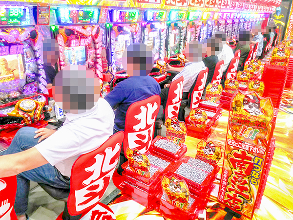 20円パチスロを見ると「バジリスク~甲賀忍法帖~絆」や「ミリオンゴッド-神々の凱旋-」などでプレイヤーの華麗なパフォーマンスが目立ち、シマ全体に華やかな光景が広がっていた。