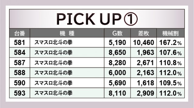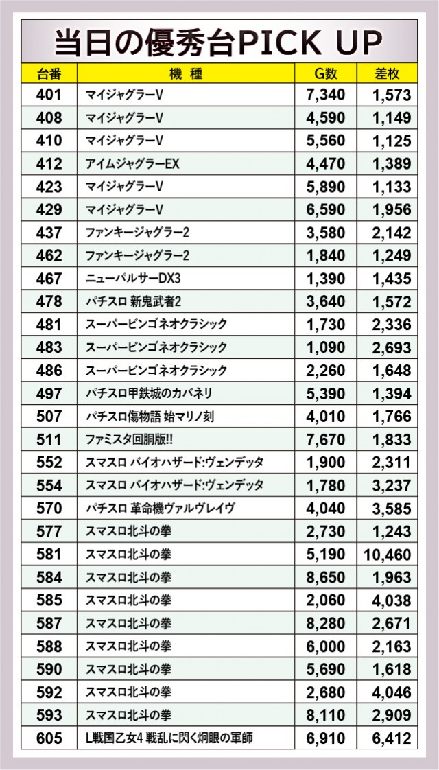 ファンから圧倒的な支持を集めていたのが『ジャグラー』シリーズで、どの機種も万遍なく遊技されていたのが目に焼きつく。大きな熱こそ放ってはいないが、回転数から鑑みるに、大きな手応えを感じていたのではないだろうか。一方で差枚数に着目すると、『スマスロ北斗の拳』581番台+10,460枚という偉大な記録が発生。続いて『L戦国乙女4 戦乱に閃く炯眼の軍師』605番台+6,412枚という数字も確認でき、盛り上がりに包まれていたようだ。