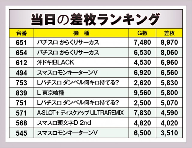 『パチスロ からくりサーカス』にて2台の8,000枚OVERが発生しており、当日の店内の盛り上がりをリード。そして『沖ドキ!BLACK』『スマスロモンキーターンV』から6,000枚OVERも生まれ、店内各所で大台突破台が飛び出していたのが鮮烈であるばかり。新台『L 東京喰種』は9,000回転台で終日を通して打ち込まれており、ファンがポテンシャルを感じ取っていた点も見逃せないポイントだ。