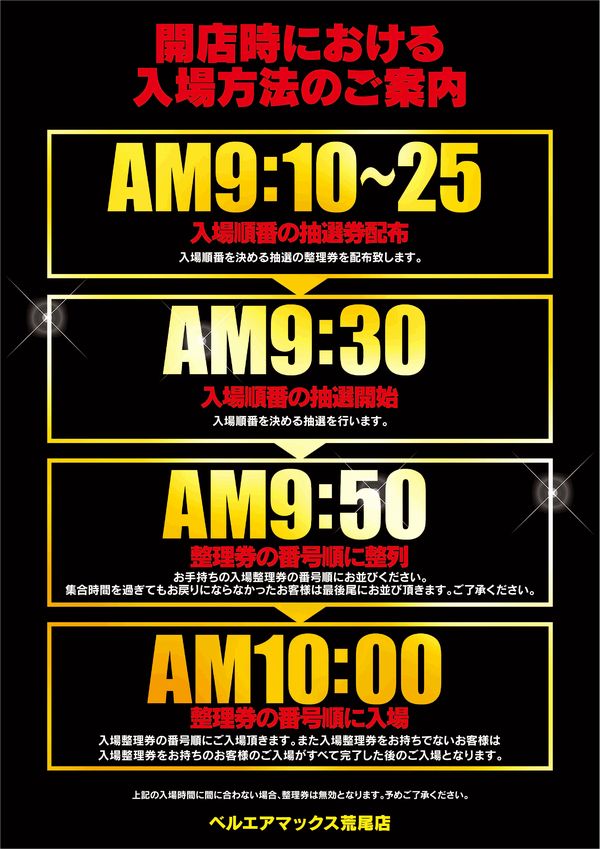 入場順番の抽選券配布=9時10分~9時25分。入場順番の抽選開始=9時30分。整理券の番号順に整列=9時50分。整理券の番号順に入場=10時。 |