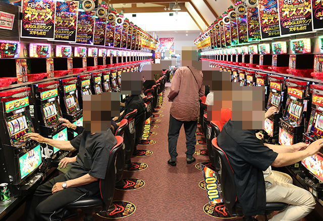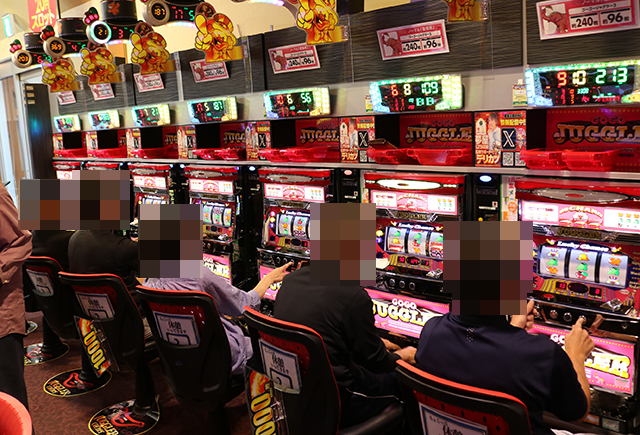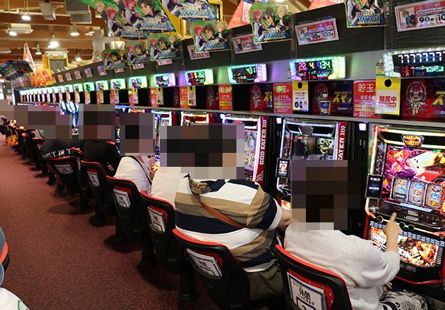 多くの台に持ち玉で遊技をおこなう姿があった「アイムジャグラーEX」。