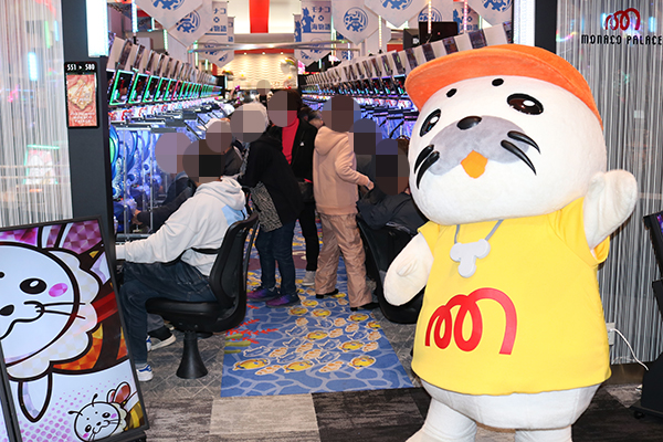 さらに取材当日は、モナコパレス公式キャラクター・タマちゃんが来店!! ホール内を大いに盛り上げるため、大勢のプレイヤーとふれあっていた。