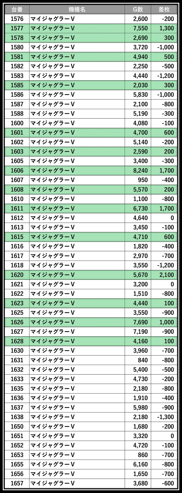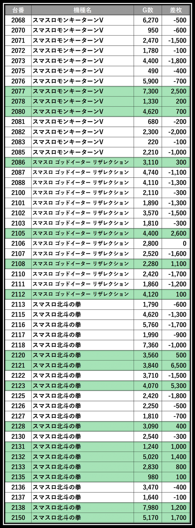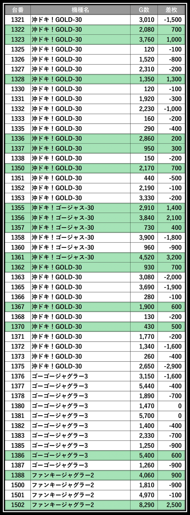 ※差枚数順に掲載しています