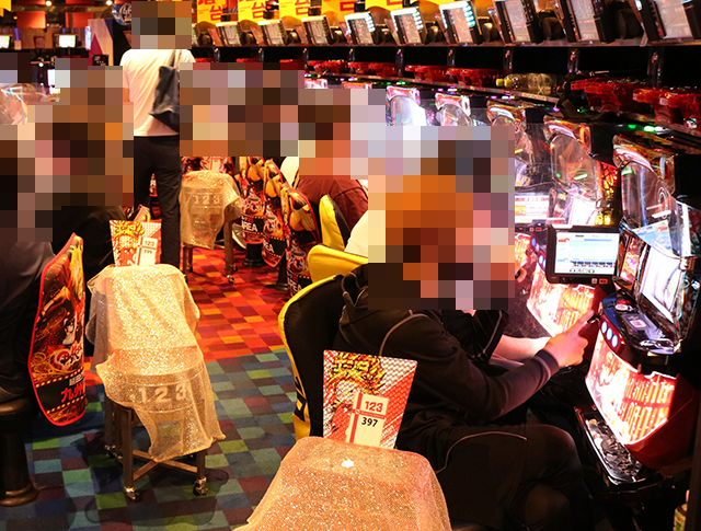 17時頃の「パチスロ 新鬼武者2」は、離席しているプレイヤーがいたものの、満席となるほどに人気であった。
