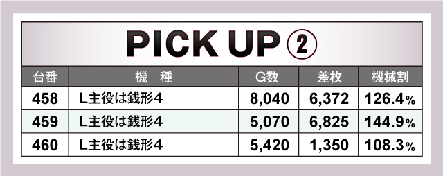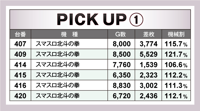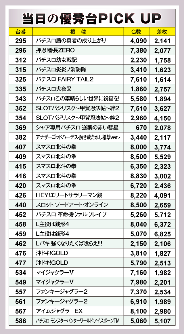 当日のホール内は、スマスロを筆頭にさまざまな機種が活躍していた。優秀台を見てみると、多くのスマスロ機種が選出された。特に『スマスロ北斗の拳』は、PICK UPされた6台の合計差枚が+18,000枚を越える大記録! さらに『L主役は銭形4』でも+6,000枚オーバーが2台出現と、素晴らしい結果を残していた。