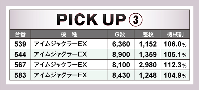 また、ノーマルタイプでも安定した成績を残しており、『アイムジャグラーEX』では4台が+1,000枚以上を獲得。定番機種にもしっかりと力を入れているのは、優良店の証と言えるだろう。