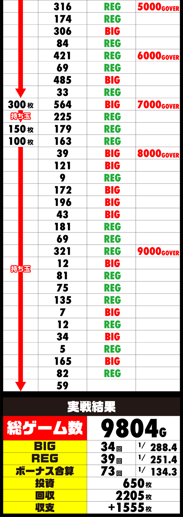 ボーナス確率をみると、まさに高設定といった数値。1万回転到達に遠回りとなるキビしい展開に、最後はついていくことができなかったようだ。