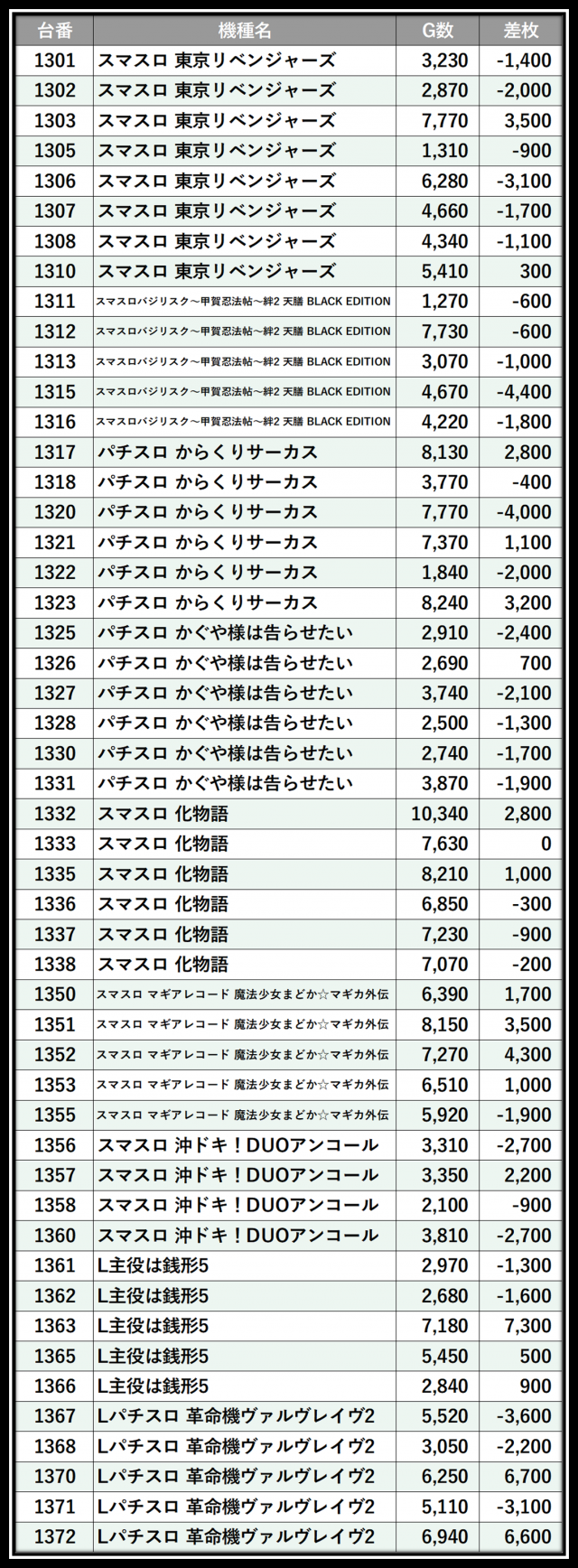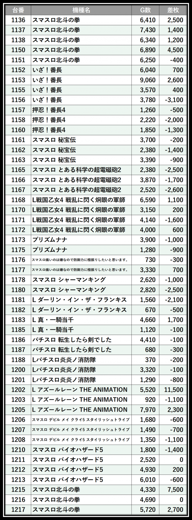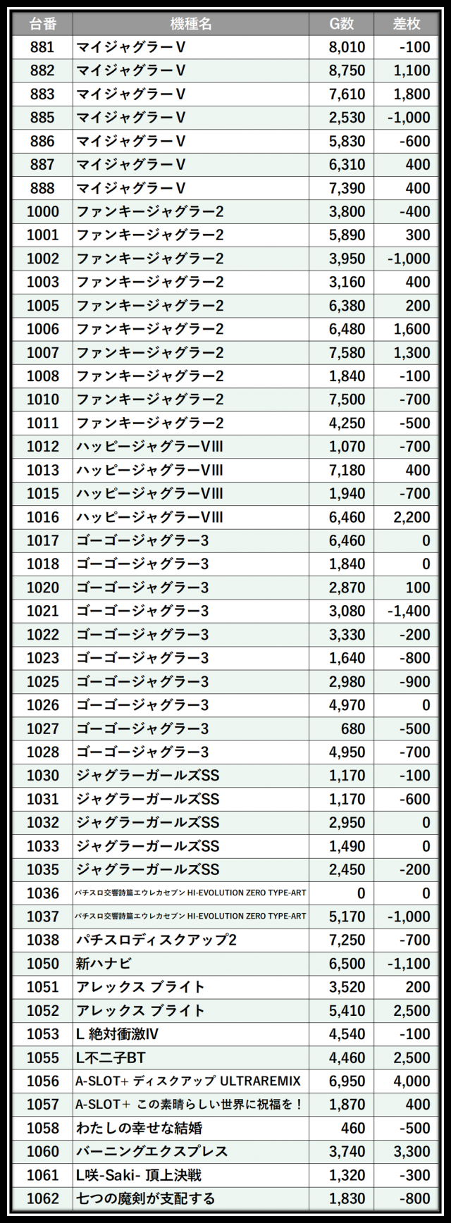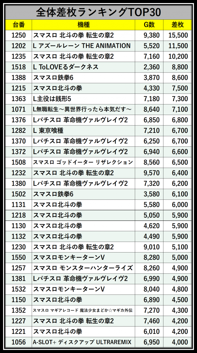 ※差枚数順に掲載しています