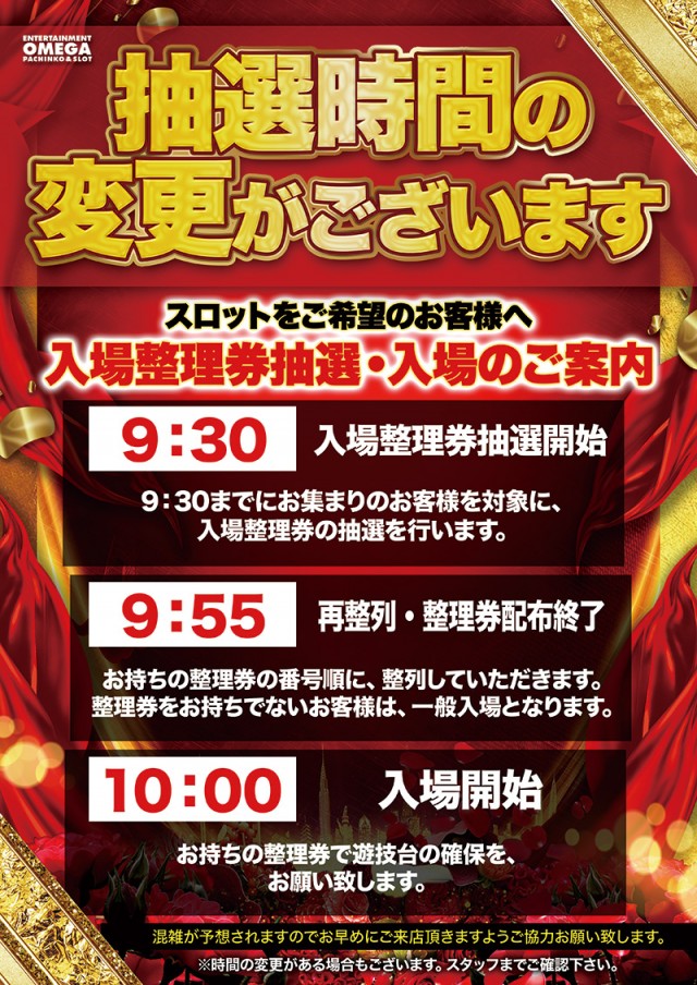スロットのみ抽選会開催9時40分までお並びのお客様シャッフル!(変更がある場合がございます) |