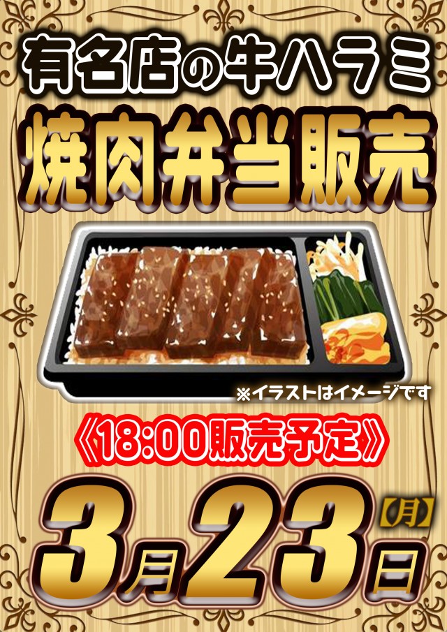 3月23日(月)10時開店 有名店焼肉弁当販売会開催!