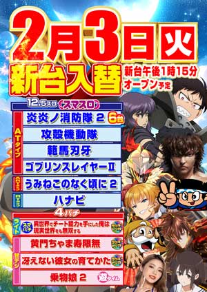 2月3日 🌈10機種19台の新台入替🌈是非ご来店ください😀