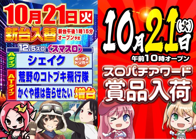 明日10月21日🔥新台入替🔥&🎁スロパチアワード賞品入荷🎁