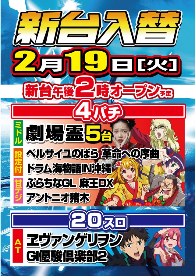 明日【19日】7機種17台導入!抽選は13時40分より!