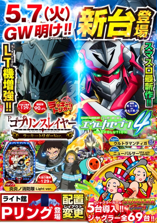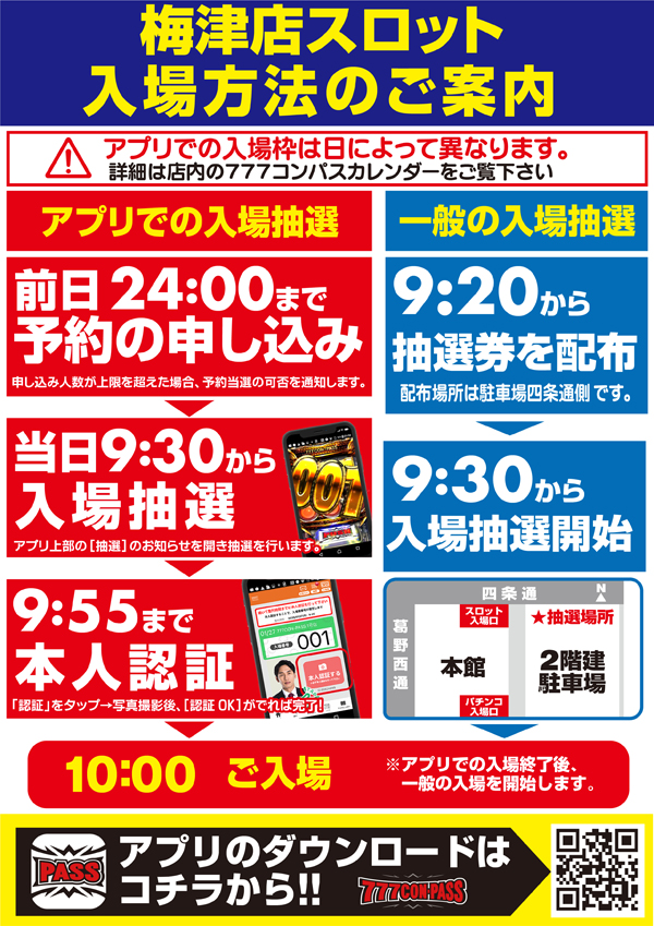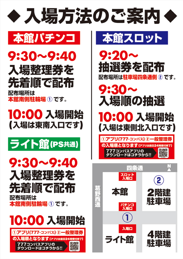 パチンコはAM9:00より先着順で入場券配布。スロットはアプリでの入場抽選とAM9:30より店舗駐車場で一般抽選を行います。※アプリでの入場終了後に一般の入場を開始します。 |