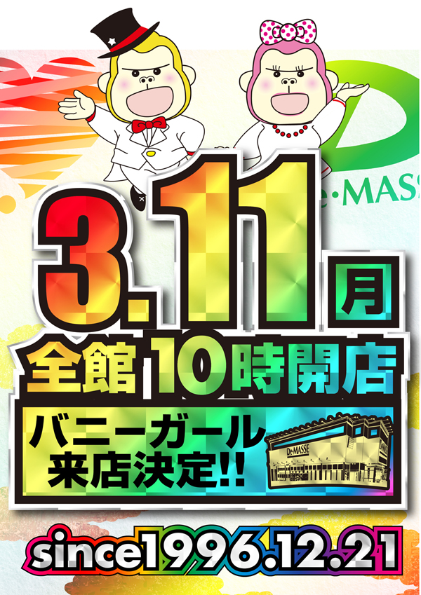 パチンコはAM9:00より先着順で入場券配布。スロットはアプリでの入場抽選とAM9:30より店舗駐車場で一般抽選を行います。※アプリでの入場終了後に一般の入場を開始します。 |