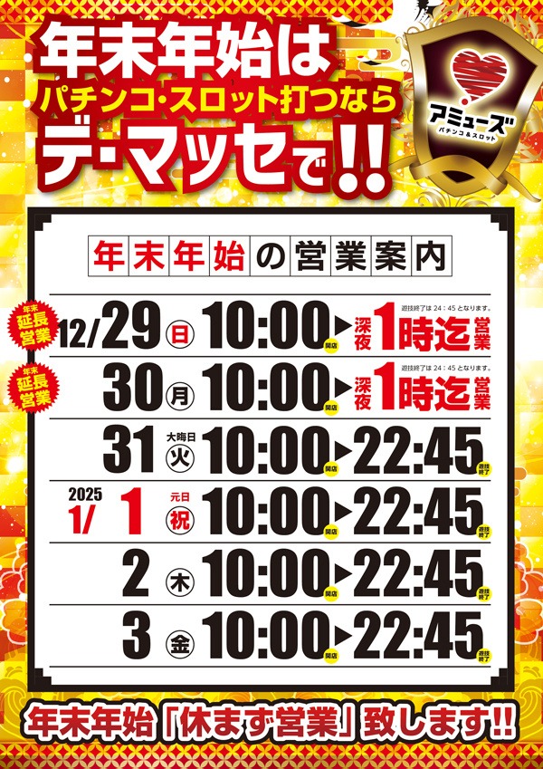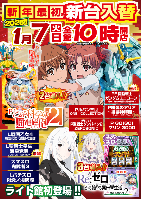 明日1月7日【火】全館10時開店!2025年初の新台入替!