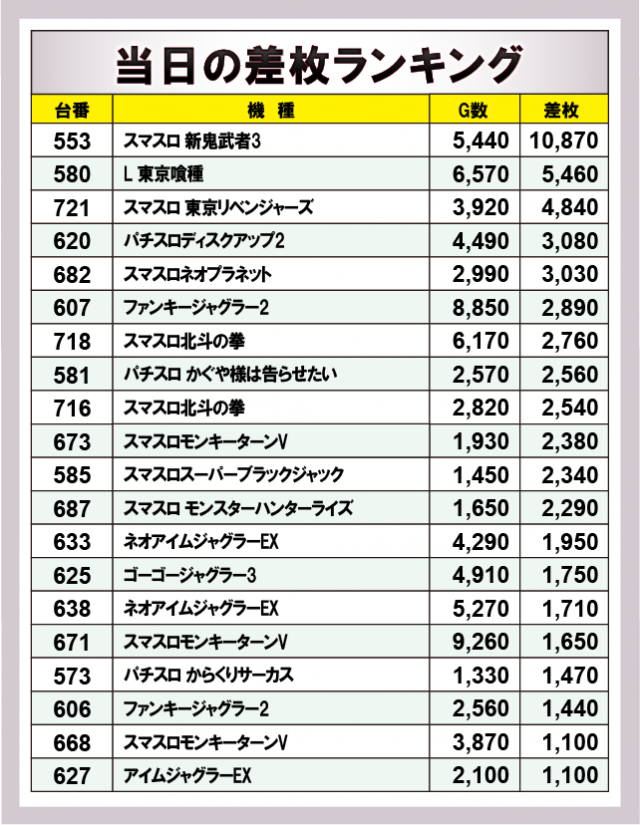 今回の差枚ランキング上位には『スマスロ 新鬼武者3』『L 東京喰種』が揃って高差枚を叩き出し、序盤から期待に応える展開に。『スマスロ 東京リベンジャーズ』『パチスロディスクアップ2』『スマスロネオプラネット』『ジャグラー』シリーズといった人気どころも加わり、幅広いジャンルの機種が高水準の結果を残した。