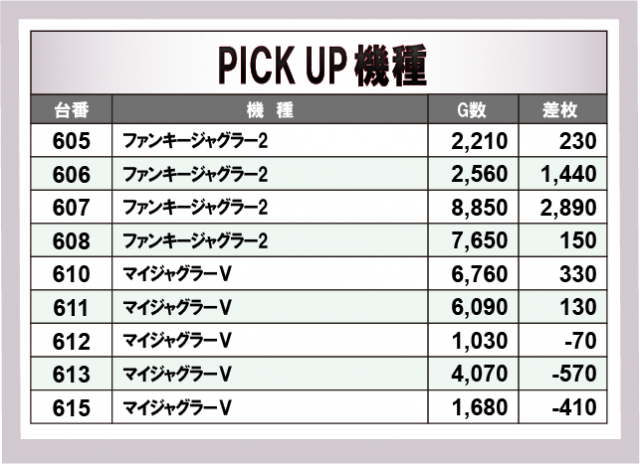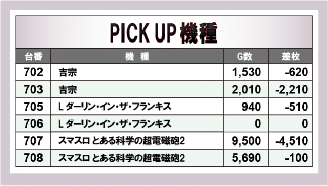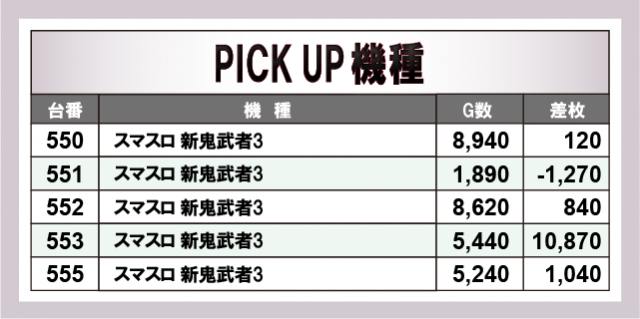 今回のPICK UP機種では、『スマスロ 新鬼武者3』や『スマスロ とある科学の超電磁砲2』で高稼働を記録し、Aタイプでは『ファンキージャグラー2』『マイジャグラーV』が堅実な差枚をマーク。さらに、機種をまたいで近い並びで良挙動が続く場面も見られ、エリアとしても整った仕上がりを感じさせていた!ジャンルを問わず幅広い機種でチャンスが広がっていたようだ。