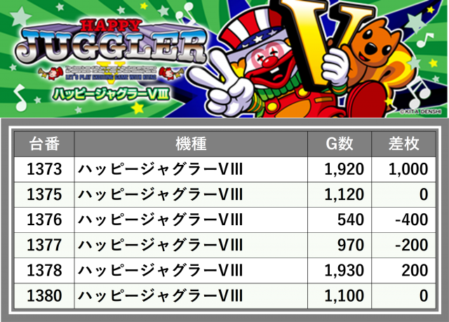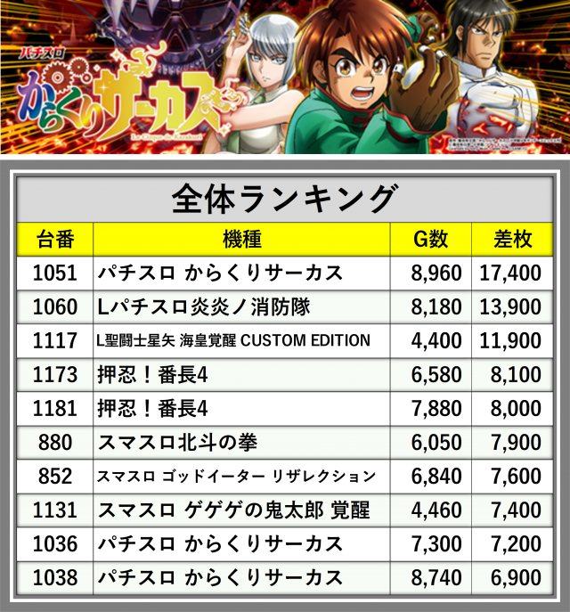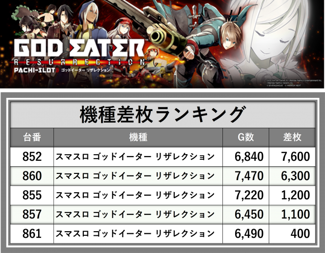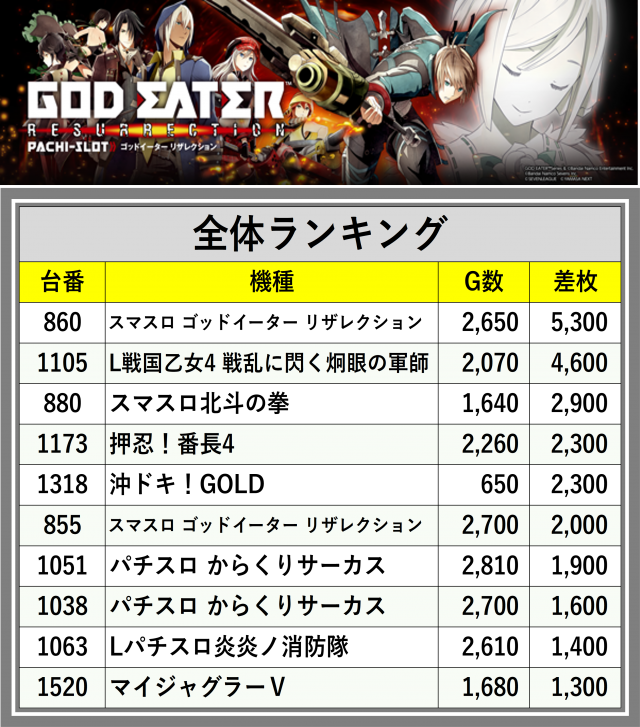 厳選された取材対象機種をはじめ、その他スロット全体から好記録が飛び出した!プレイヤーが楽しんだ1日を下記データにて振り返ってみて欲しい。