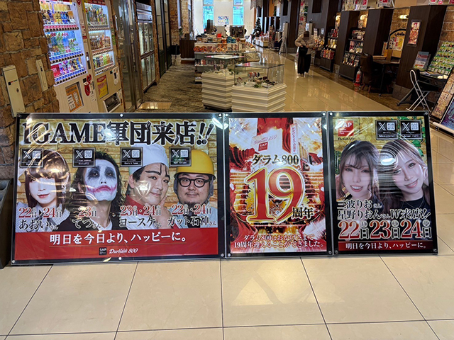 当日は店舗の至る所に「19周年」をお祝いするポスターや看板等が散りばめられるほか、1GAME軍団・三波りお・星野りおんの来店が重なり、店内は凄まじい熱気に包まれていた。