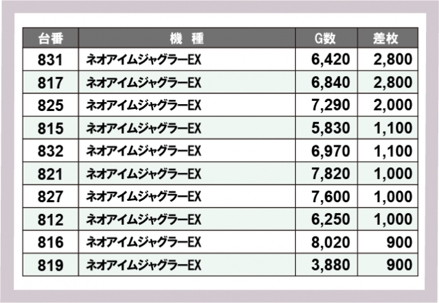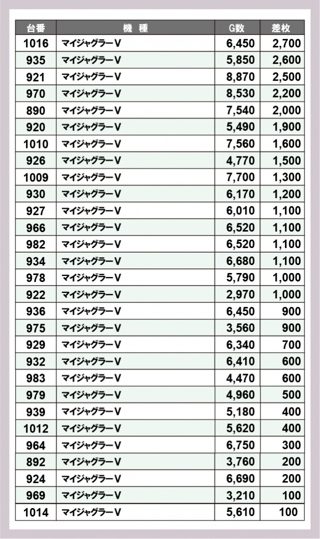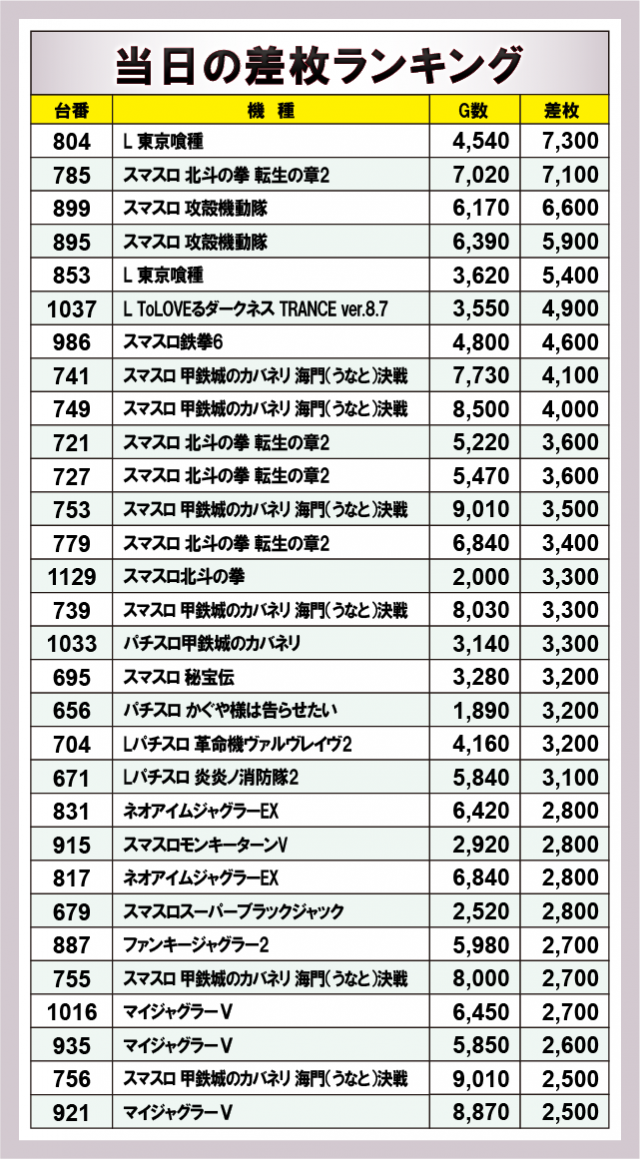 ※差枚数順に掲載しています