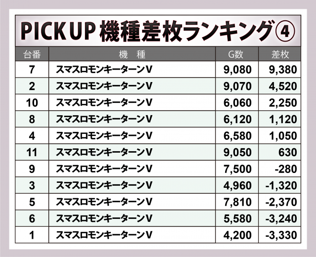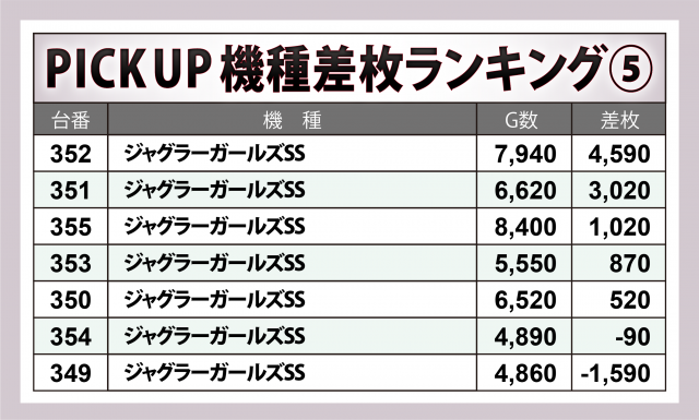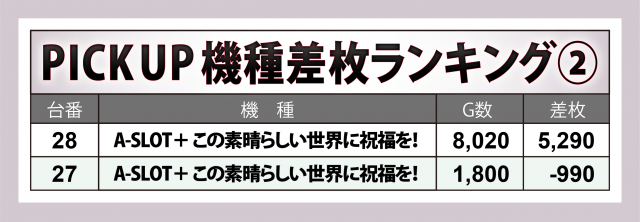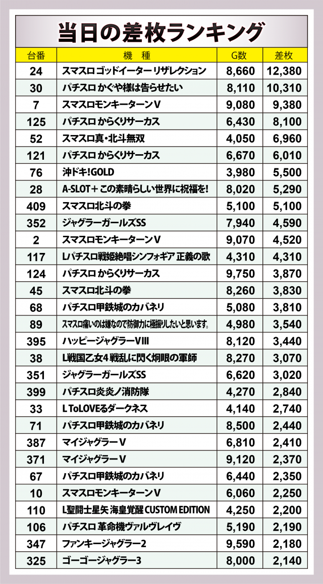 万枚オーバーが2台、トップ30・注目5機種がハイクオリティな差枚数を叩き出し、初戦に次ぐ上々の成果を招いた。