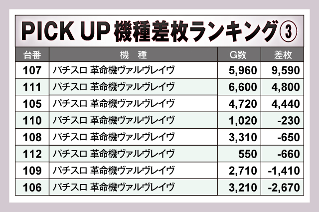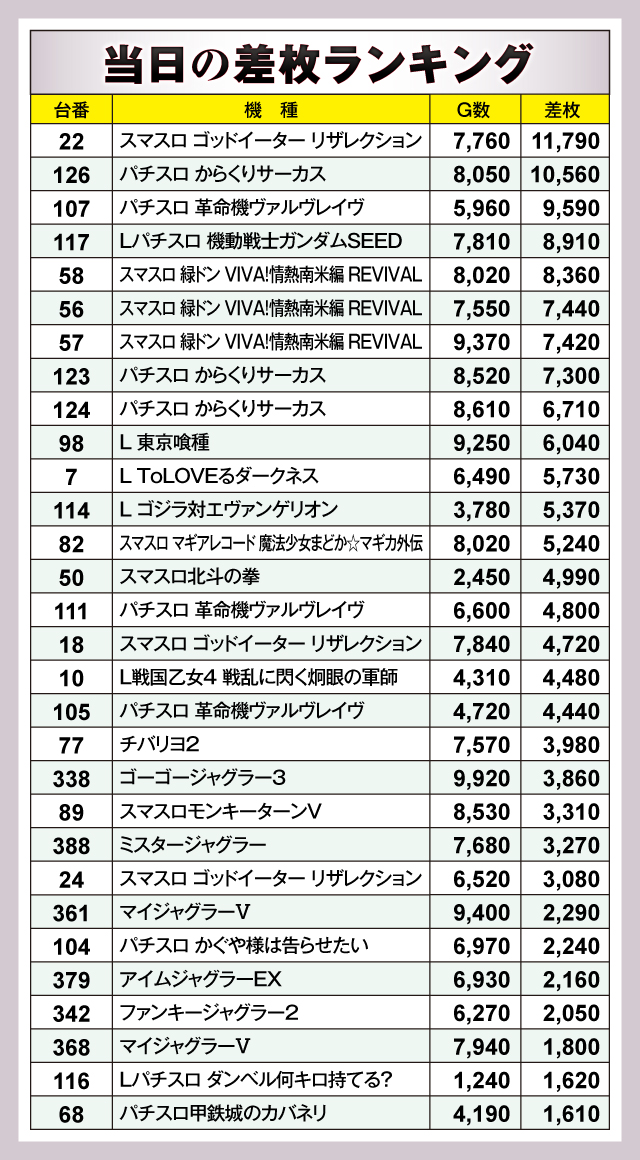 惜しくも届かなったのが『パチスロ 革命機ヴァルヴレイヴ』107番台の+9,590枚。以下『Lパチスロ 機動戦士ガンダムSEED』117番台の+8,910枚や、『スマスロ 緑ドン VIVA!情熱南米編 REVIVAL』の+8,360枚・+7,440枚・+7,420枚の3連続ランクインなどなど、超優秀台がギッシリ詰めこまれた見事なランキングとなった。