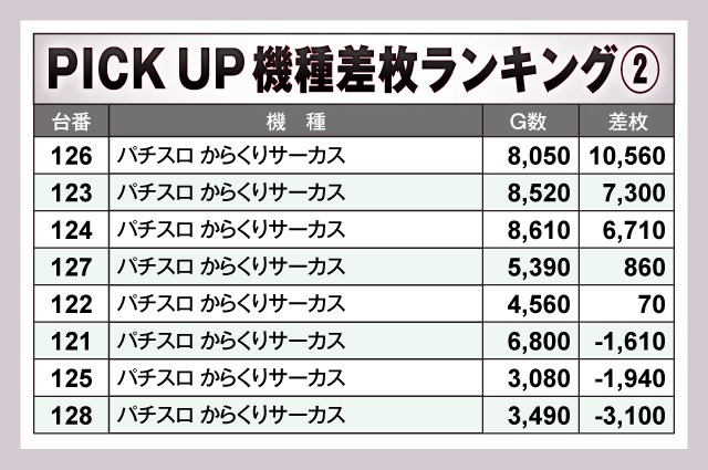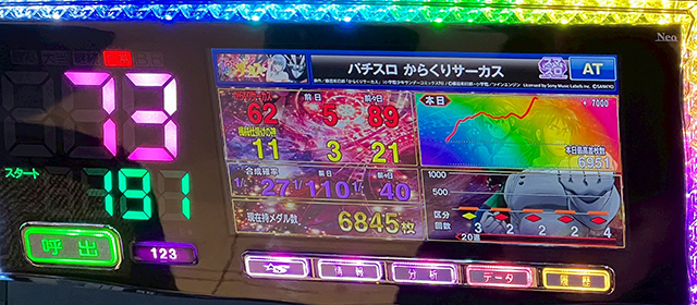 この日最大の見どころは2台のデッドヒート。制したのは『スマスロ ゴッドイーター リザレクション』22番台で+11,790枚、次いで『パチスロ からくりサーカス』126番台が+10,560枚と、万枚達成同士の超ハイレベルな攻防を繰りひろげていた。
