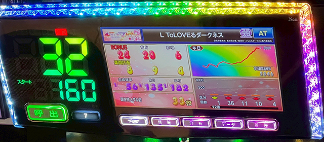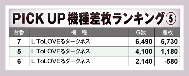 8台設置の『パチスロ からくりサーカス』と『パチスロ 革命機ヴァルヴレイヴ』に関しても、G数が稼がれている台はもれなく素晴らしい差枚となっている。人気のジャグラーシリーズの中から今回は『ミスタージャグラー』をピックアップ。6台中5台がプラス差枚と高い打率におさまった。新バージョンも話題の『L ToLOVEるダークネス』は3台中2台がプラスで、トータルでも大きくプラスと実力を発揮していたようだ。