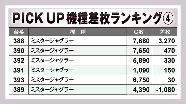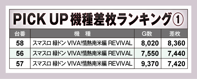 好成績をおさめた5機種をピックアップして見ていく。中でも優秀だったのは『スマスロ 緑ドン VIVA!情熱南米編 REVIVAL』。3台中全台がプラス差枚かつ、しっかり回されていて、今の人気ぶりを証明する形となった。